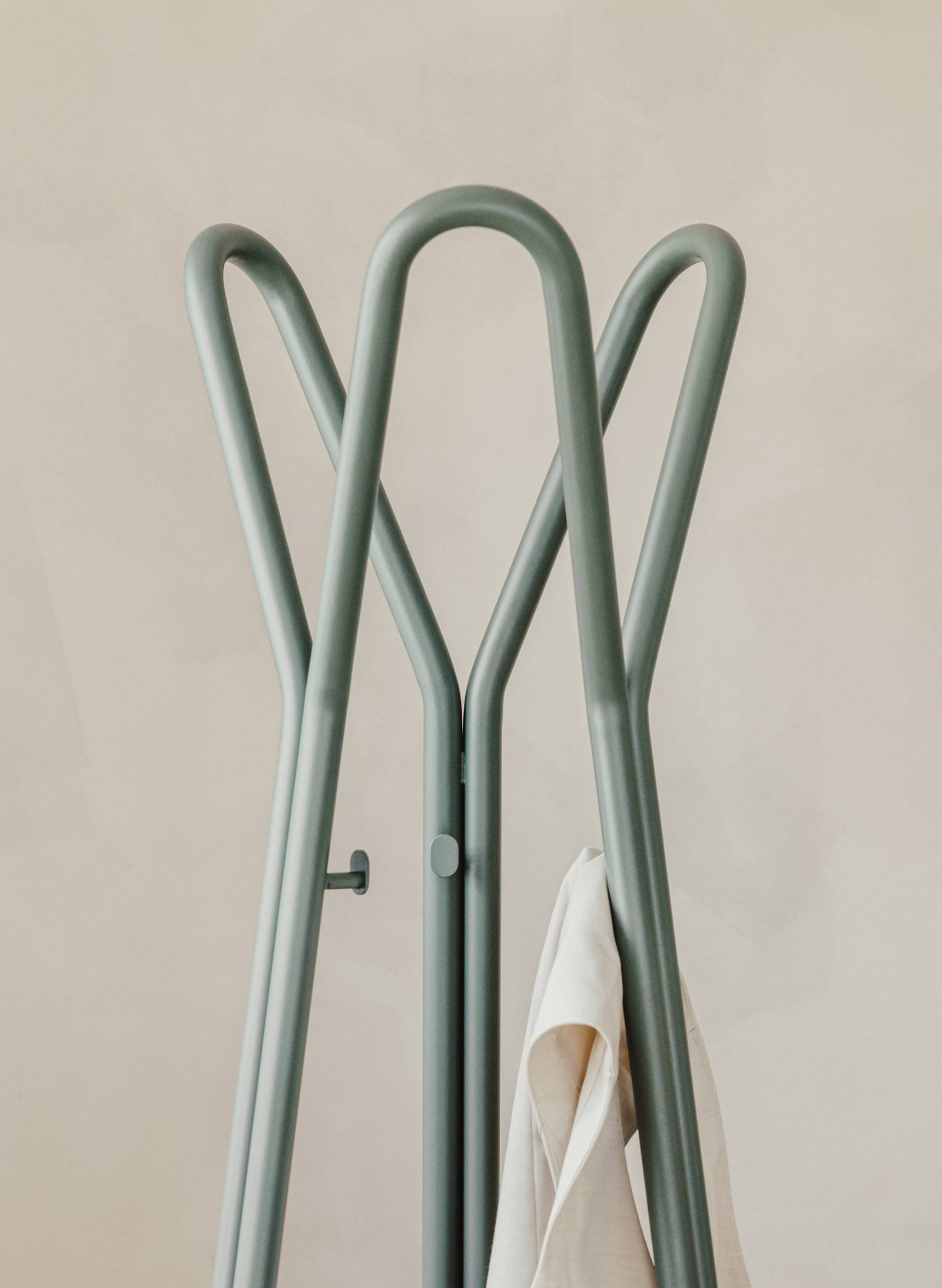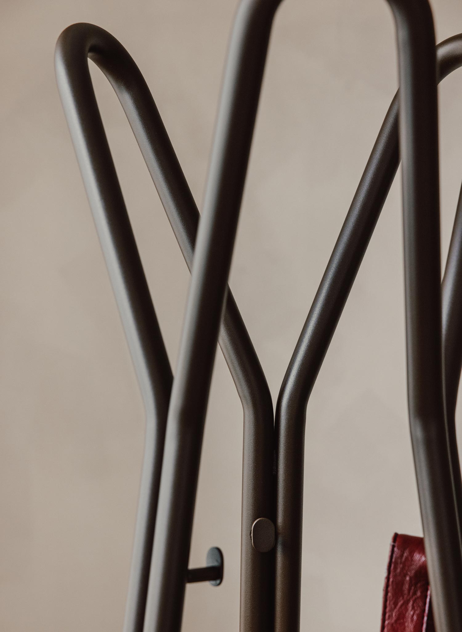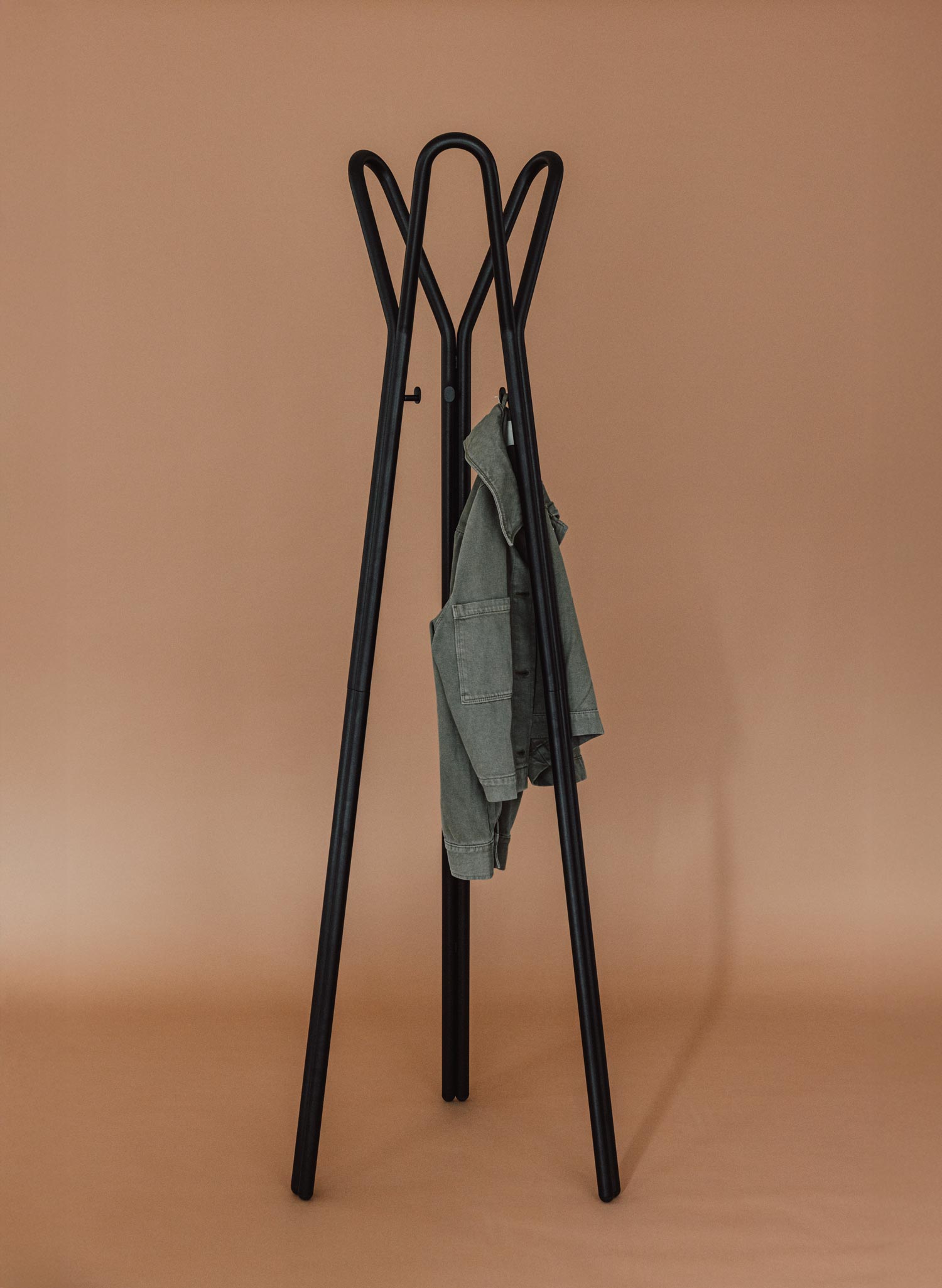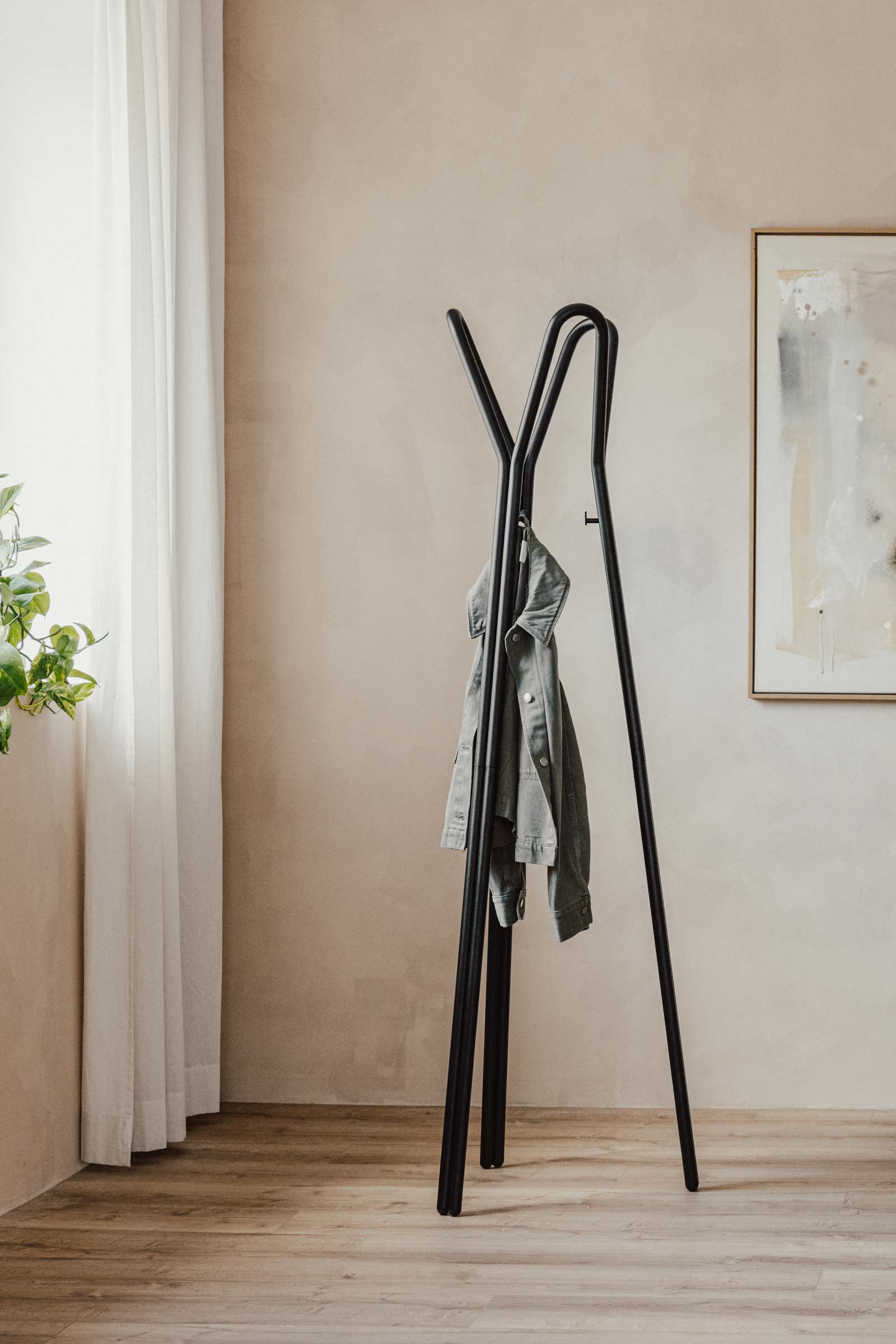 CHARLES is a freestanding coat rack reduced to essentials. Three arches rise from the ground and curve gently upward, forming an open gesture that invites garments and bags to be placed upon them. Additional hooks extend from the rods as subtle complements, increasing functionality without disrupting the clarity of the form. Stability arises from the tripod structure, while the flowing lines give CHARLES a sculptural presence that adds character to the room.