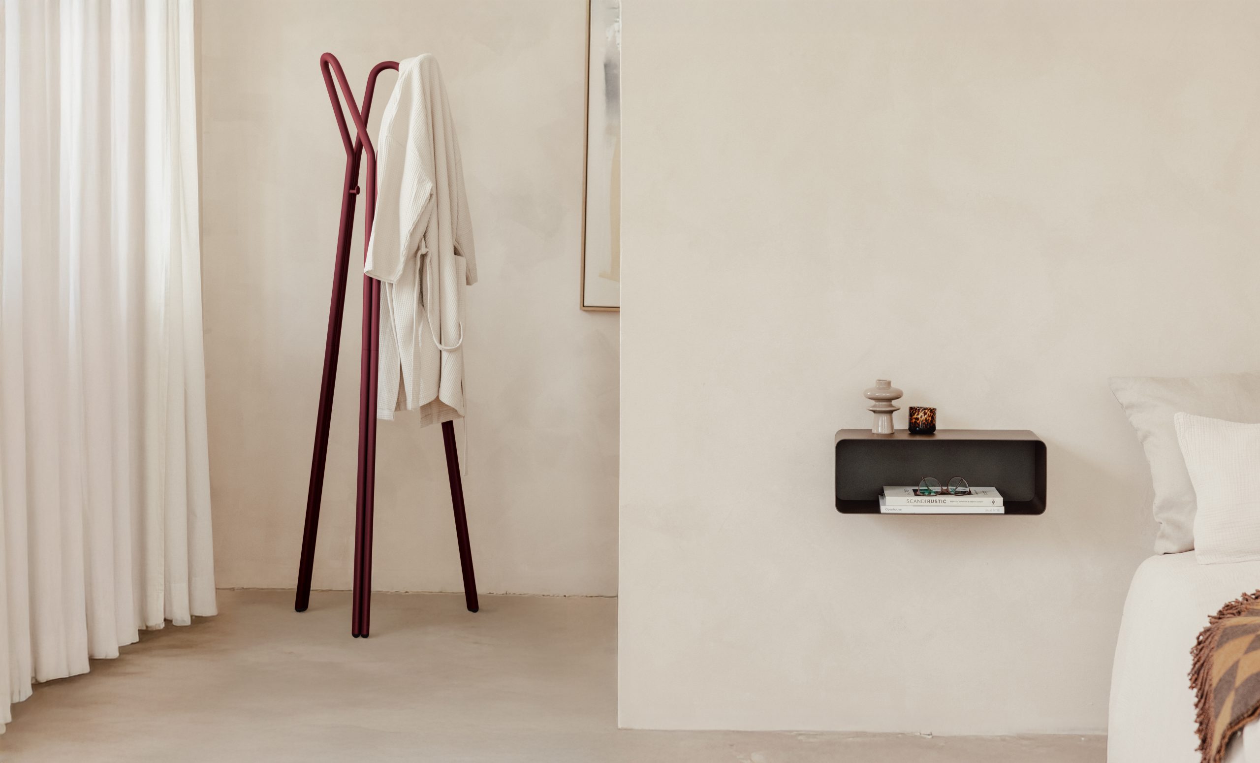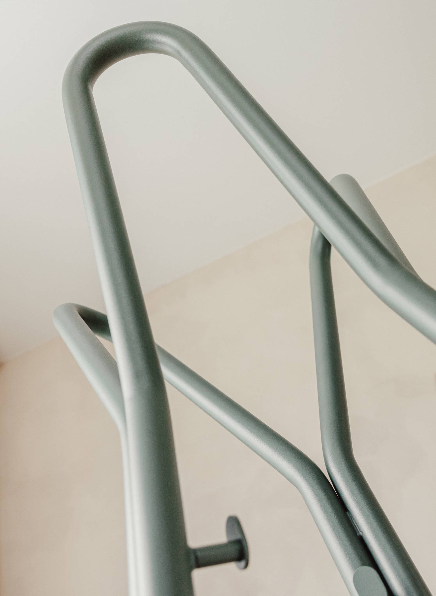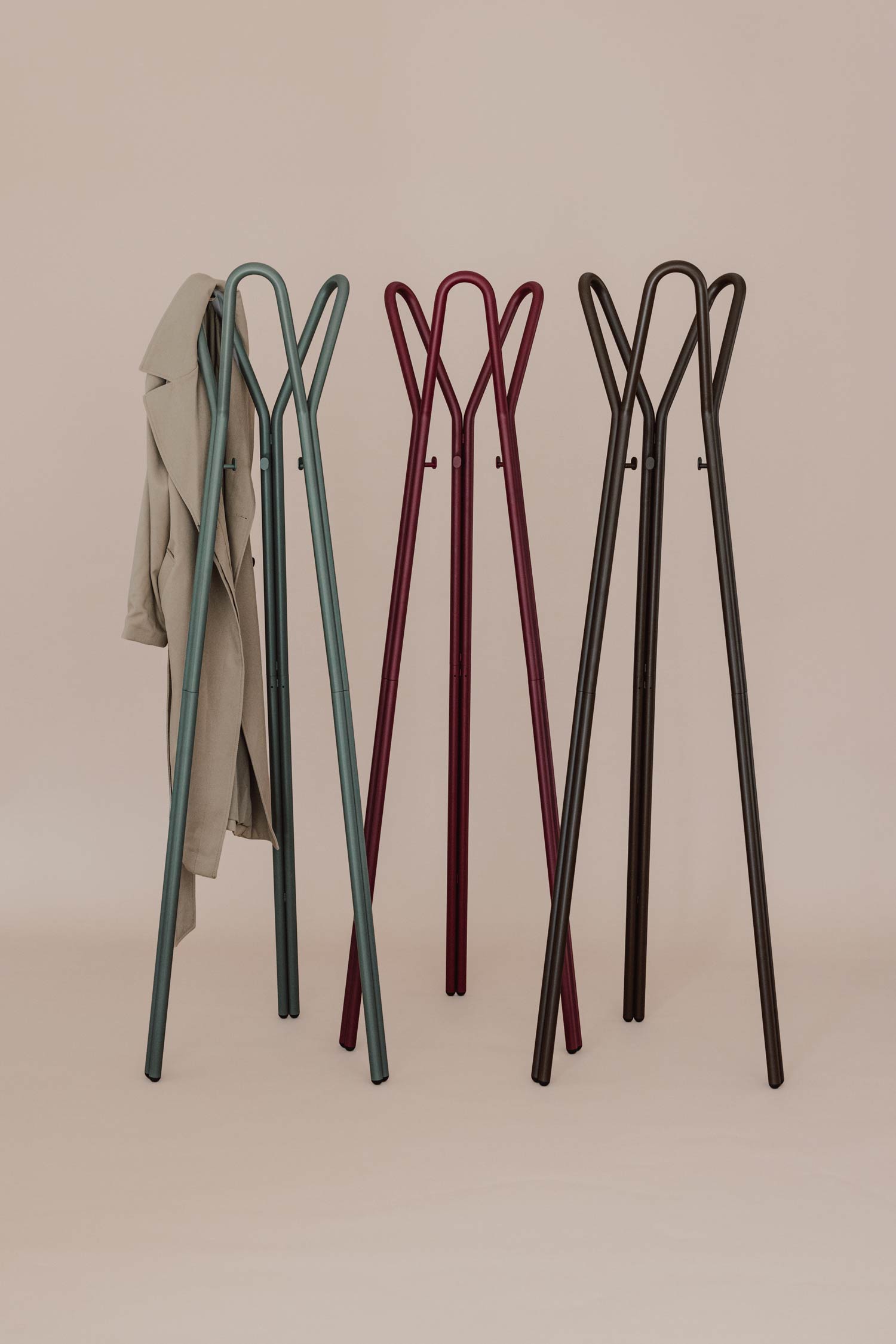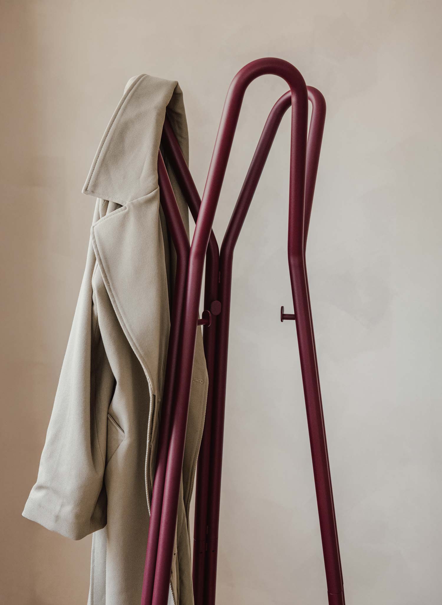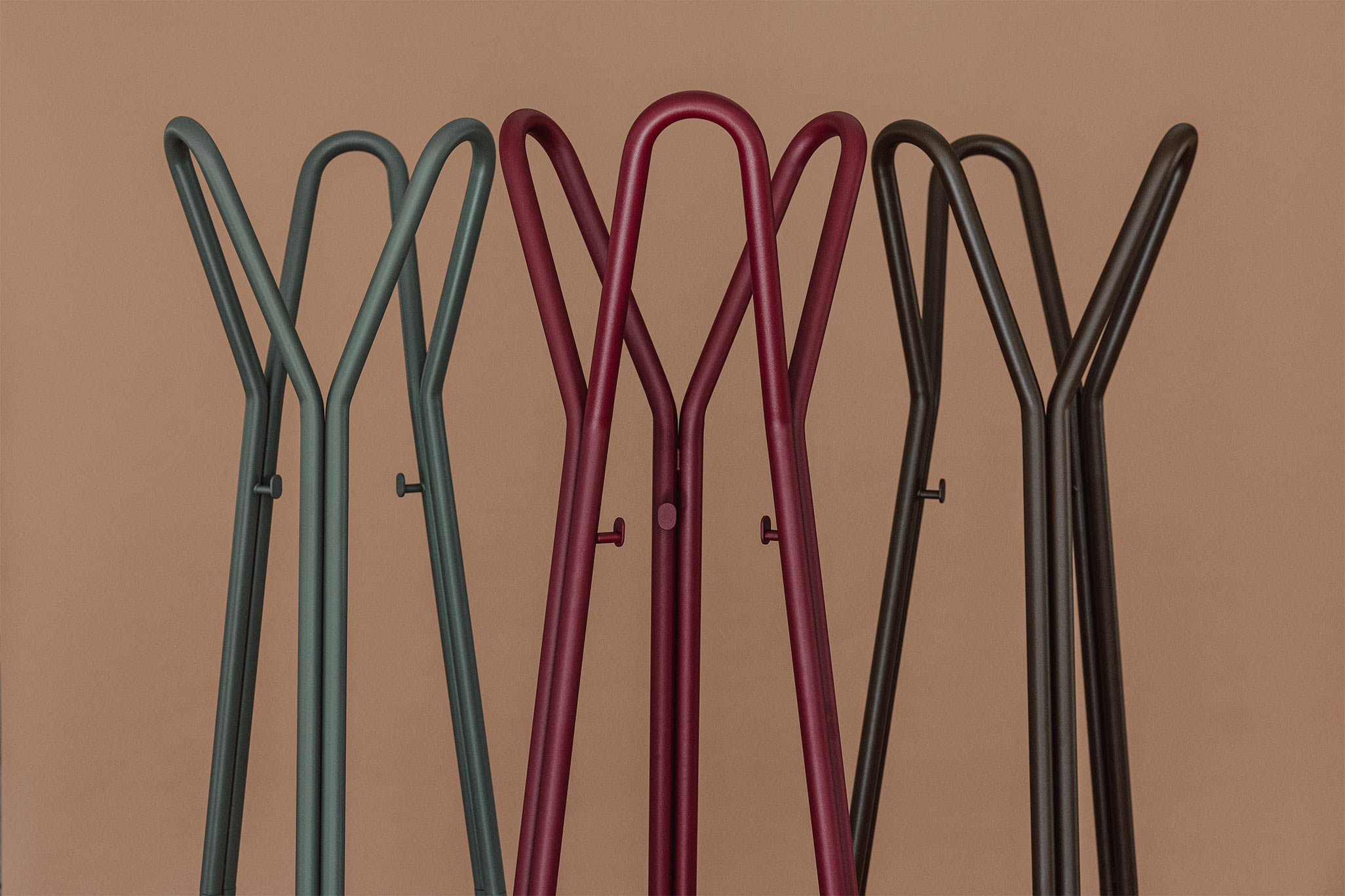 CHARLES is a freestanding coat rack reduced to essentials. Three arches rise from the ground and curve gently upward, forming an open gesture that invites garments and bags to be placed upon them. Additional hooks extend from the rods as subtle complements, increasing functionality without disrupting the clarity of the form. Stability arises from the tripod structure, while the flowing lines give CHARLES a sculptural presence that adds character to the room.